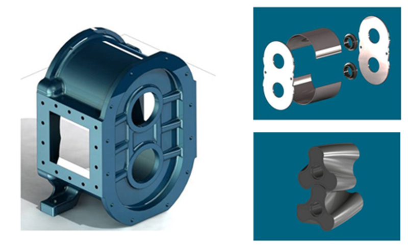 凸輪轉子泵屬于容積泵,有兩個相向旋轉的轉子安裝于平行的同步齒輪軸上,轉子與泵殼之間不斷形成小的腔體,填充在腔體內(nèi)的介質不斷被旋轉的轉子由進口端推到出口端。